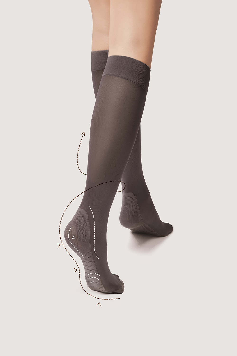 Sileät, 40 denierin yksiväriset polvisukat joissa on hierova jalkapohja ja puristamaton resori.