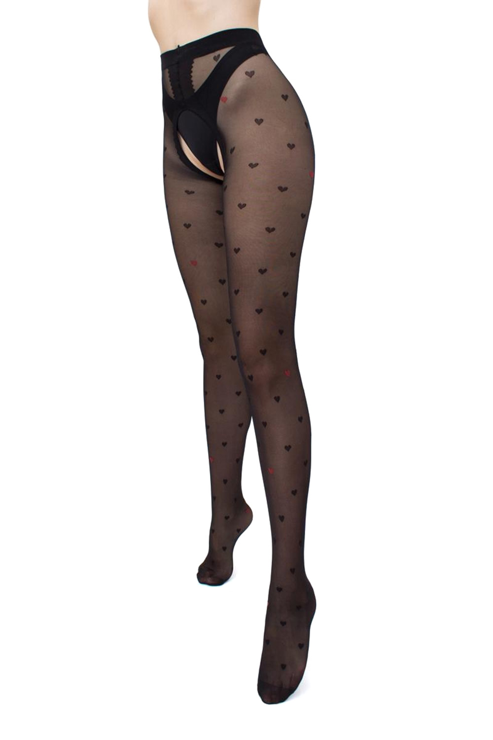 Ohuet 20 denierin haaroista avoimet sukkahousut sydänkuvioilla.