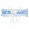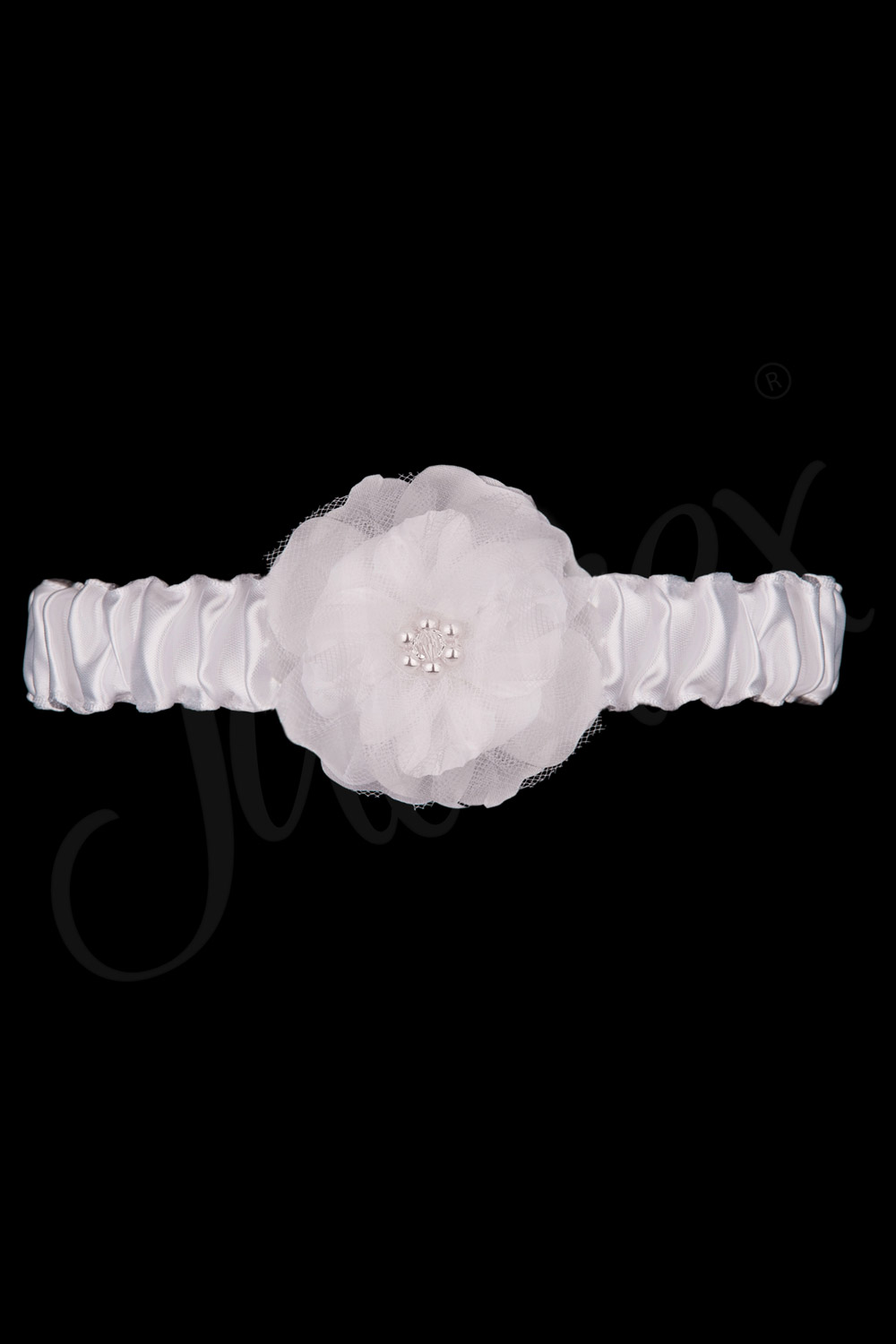 Valkoinen kapea sukkanauha suurella pyöreällä kukalla.