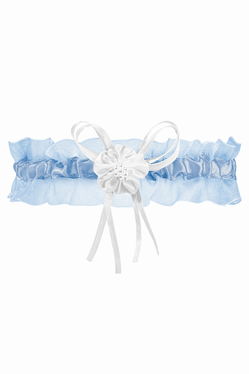 Sukkanauha sinistä satiinia ja tylliä valkoisella rusetti- ja kukkakoristeella.