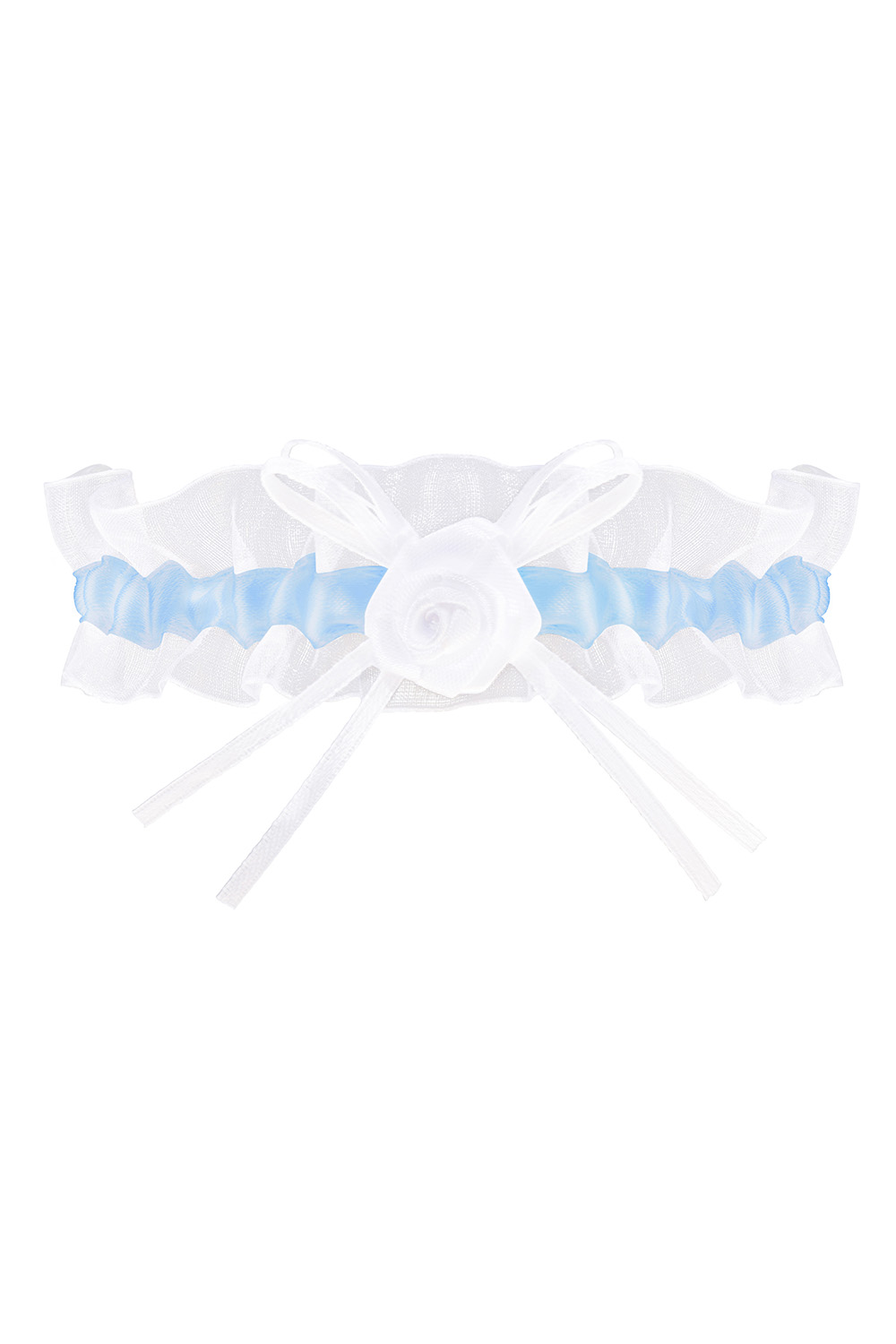 Kapeahko valkoinen sukkanauha ruusukkeella.