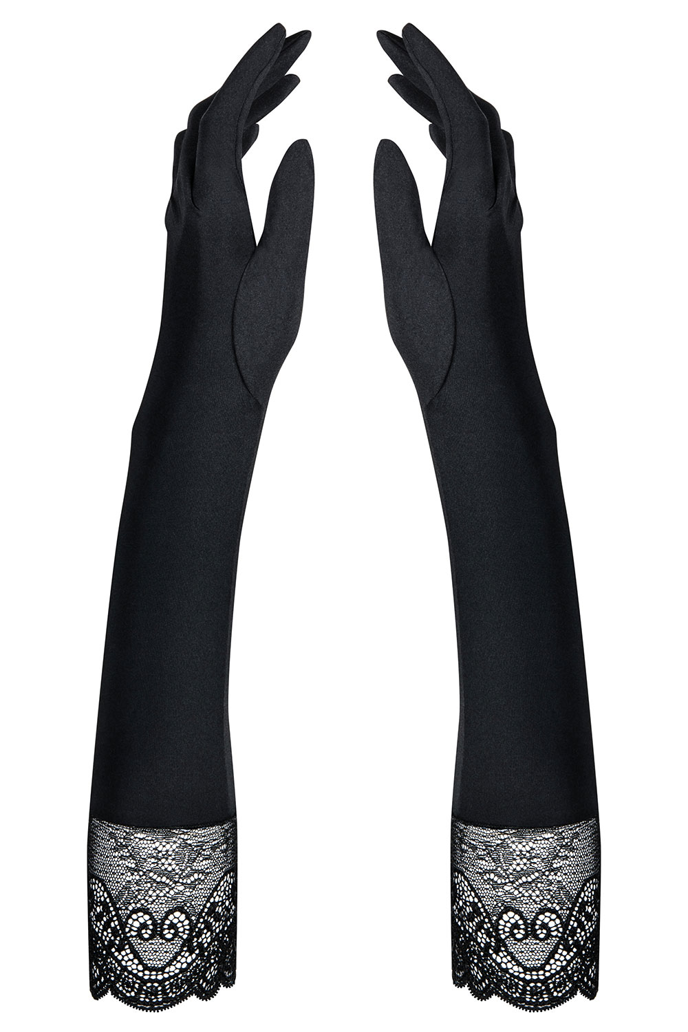 Pitkät mustat satiinikäsineet pitsisellä somisteella.