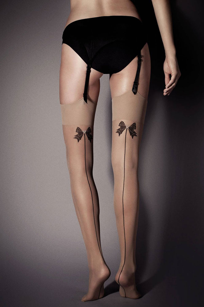 Ohuet 15 denierin sukkanauhasukat saumalla ja rusettikuviolla.